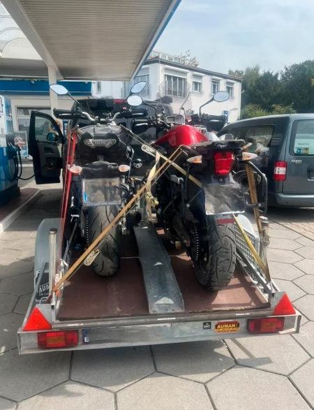 De aanhangwagen kan ook geleverd worden of uw motorfiets kan door ons getransporteerd worden.